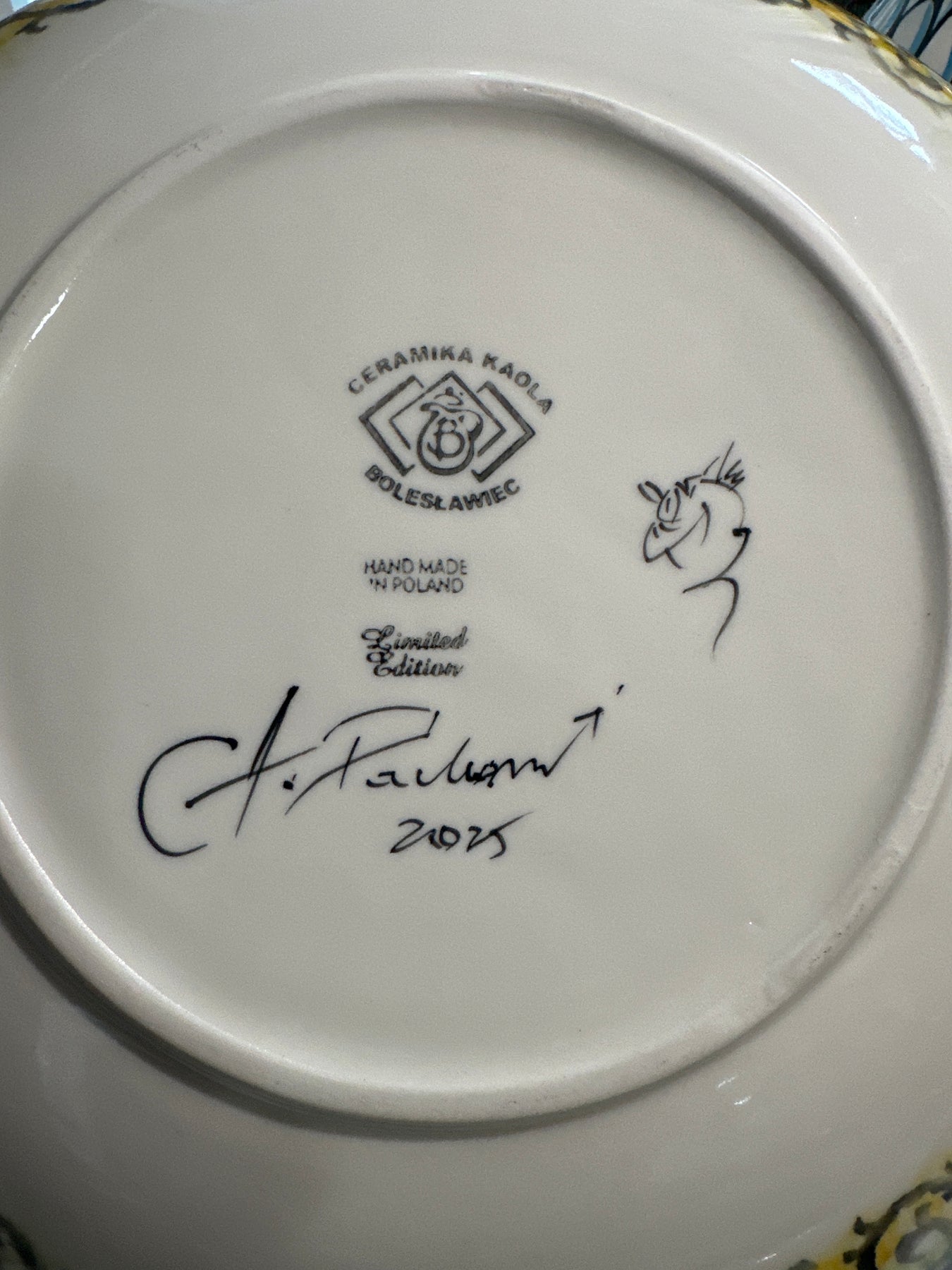 13 inch circumference with this beautiful platter done by the master artist himself, Andrezj Palcom.  Signed and dated